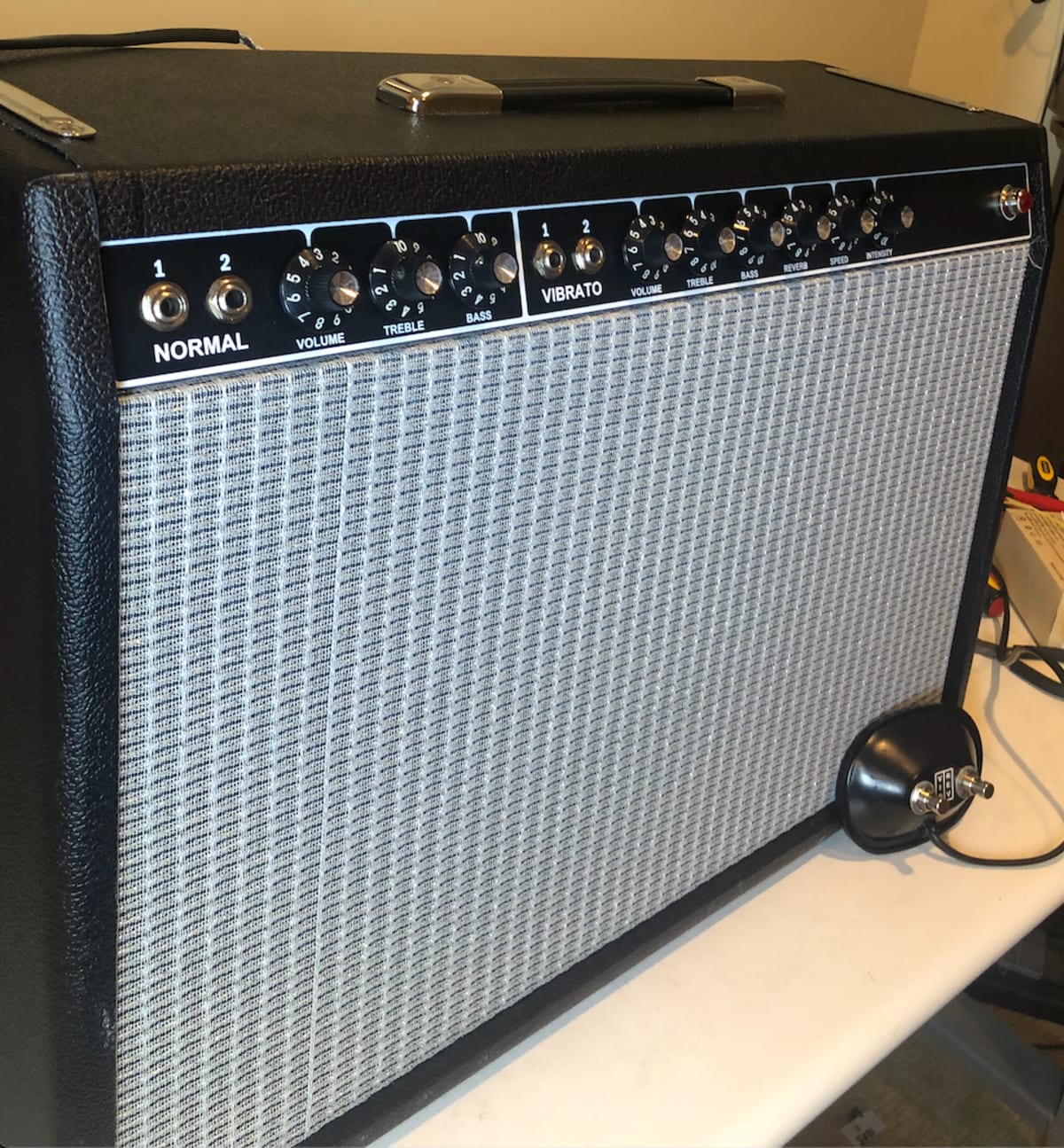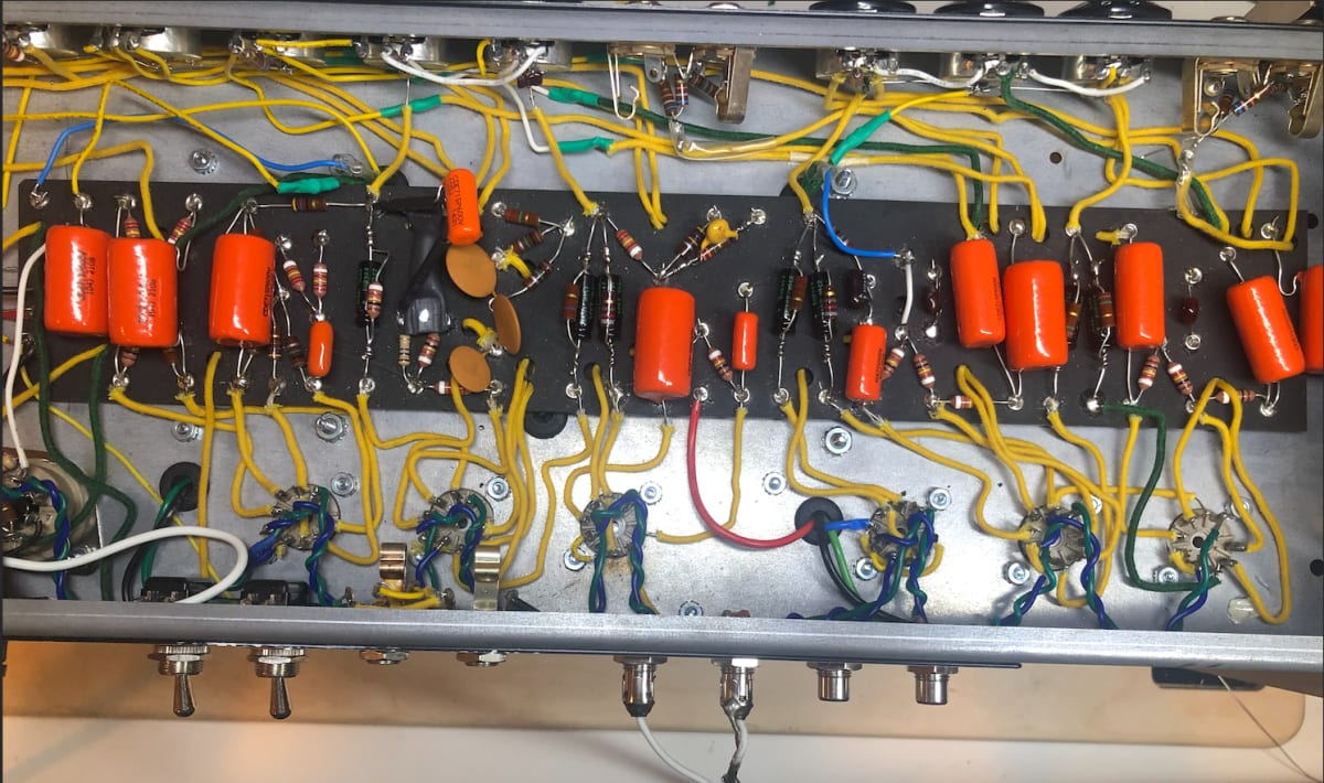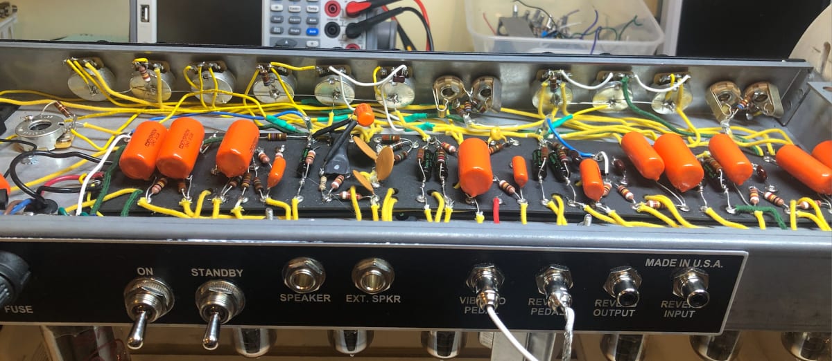 This amp follows the famous and highly coveted Fender AB763 circuit. While building this amp, I had one major difficulty, and that was with the tremolo system. To try and troubleshoot this issue, I asked Mojotone for the bottom of the board point by point voltage chart and, carefully, went through the bottom of the board voltages. I found that one of them was off. This led me to the conclusion that one of my connections wasn't solid, so I probed point by point through the circuit, and noticed that one of my solders wasn't working. I then re-soldered it, and it works like a charm.