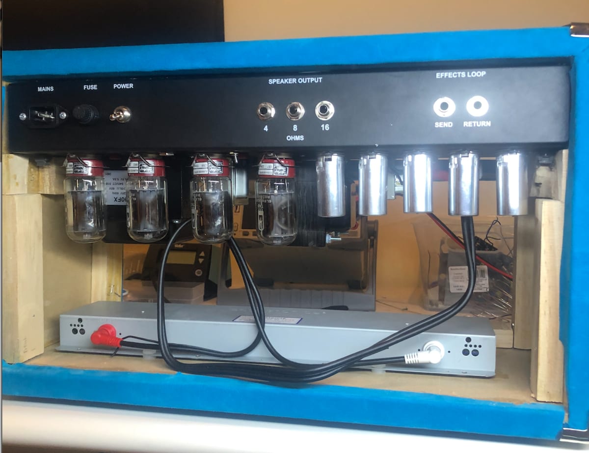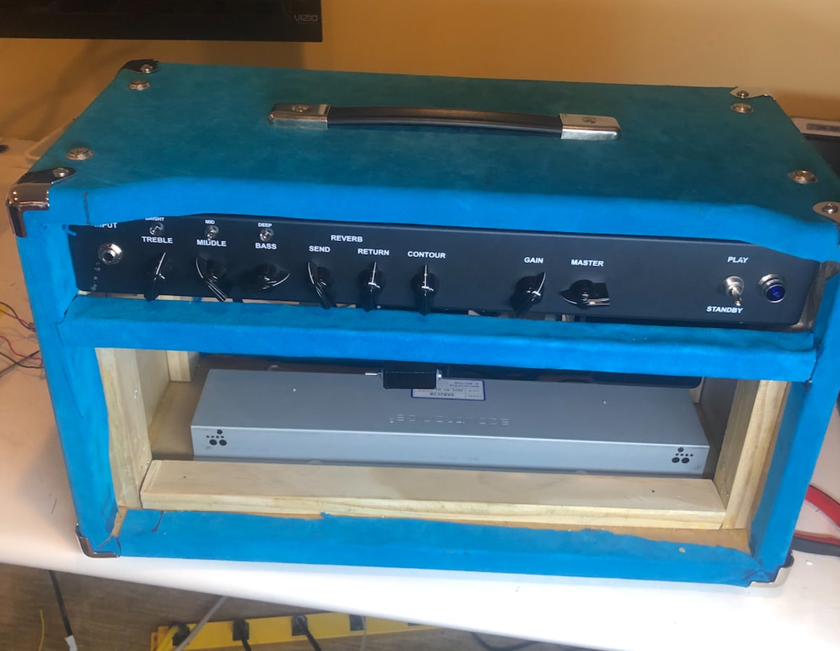Overall, this build wasn't too hard, but was extremely informative on good amp build practices, including Coax and marking Cap foils. You are probably thinking the inside of the amp is a mess, to which I say "Yes it is, however, for my second amp build ever, I am still very proud." I would highly recommend this PCB over trying to build this point to point, and the ease of this hybrid PCB style amp build will probably mark the end of me building point to point amps because these are just as easy to service as a point to point amp (because everything is still wired by hand) and I don't have to worry about underboard traces. I am extremely happy with how this amp turned out and I love how it sounds. That being said, the fact that it isn't a combo makes it extremely difficult to transport from place to place, and it is extremely loud, so keep that in mind when thinking about building one of these amps. Below are some more pictures of the completed amp.