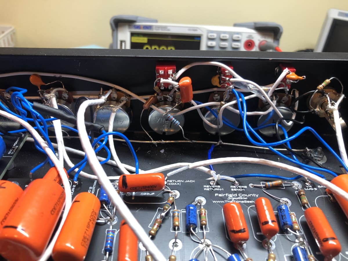 On my last amp, I fully hand wired the whole thing. While this was a good experience to have, all of the under-board voltage traces were kind of a pain in the butt to do. That's why for this build, I decided to buy a PCB from Ryan Colgan at thetonegeek.com. You may be thinking to yourself "PCBS just make it harder to service down the line because it is impossible to know where all of the traces are", However, this PCB has a hybrid design between a typical PCB amp and a hand-wired amp. All of the tubes are still hand-wired, as well as all of the connections between most of the components. The only things that aren't hand-wired are the under board voltage and signal traces, the part of point to point wiring that makes amp building suck. You can see a picture of the signal PCB below: As far as part sourcing goes, Ryan the tone geek has a whole spreadsheet of part selection recommendations. For the most part, I went with his part recommendations. These included Koa Speer resistors, Sprague Atom Power Capacitors, and 715 Series Orange Drop caps, similar to what is speculated was used in the original Two Rock. Thanks so much to Ryan for putting this whole amp parts list together and doing all of the research on the internals of the amp. Made my job as a builder so much easier.